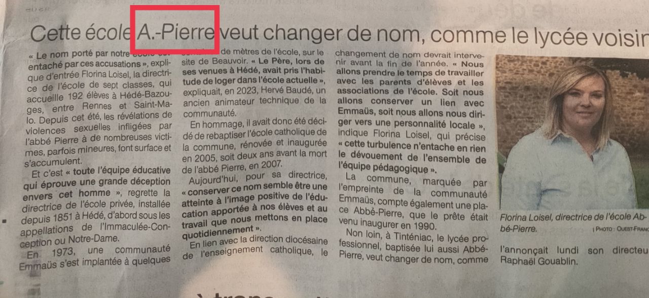 Il s’agit dans l’article d’une école, à Hédé-Bazouges, et d’un lycée professionnel à Tinténiac, tous deux en Ille-et-Vilaine et nommés en l’honneur de l’abbé Pierre, et qui ressentent l’urgence subite de changer de nom…