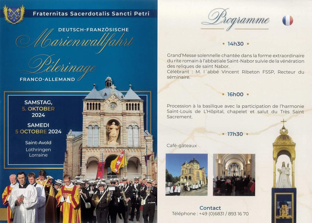 Comme chaque année, la chapelle Saint-Pierre-Canisius (District Allemagne de la Fraternité Sacerdotale Saint Pierre) de Sarrelouis (Sarre, Allemagne) organise un pèlerinage franco-allemand à Notre-Dame-de-Bon-Secours à Saint-Avold (France) le samedi 5 octobre 2024.