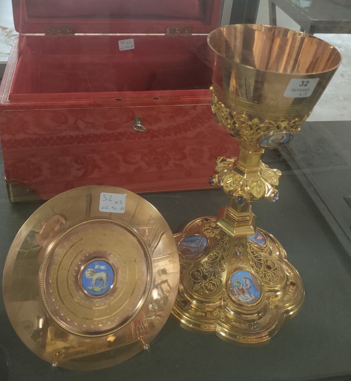Voici sa description : « la base polylobée finement gravée, appliquée de filigranes, ornée de trois médaillons émaillés représentant l’Annonciation, la Nativité et la Crucifixion et agrémentée de pierres semi-précieuses, le noeud à côtés saillantes ornées des symboles eucharistiques et de cabochons d’améthystes, la fausse coupe filigranée, ornée de trois médaillons de la Sainte Famille, la coupe finement gravée de l’inscription latine » Hic Est Enim Calix Sanguinis Mei ». Poinçon DEMARQUET Frères, Louis et Arthur (1868-1890). Avec sa PATENE en or jaune (750/°°°) centrée d’un médaillon émaillé figurant l’Agneau biblique, entouré de l’inscription latine gravée « Panis vivus agnus dei ». Poinçon DEMARQUET Frères, Louis et Arthur (1868-1890). Poinçon tête de médecin grec 3e titre. Dans un COFFRET en cuir rouge, gainé de feutre rouge. Hauteur calice : 25 cm. Poids brut (avec pierres mais sans la plaque de lestage) : 718 gr Poids patène : 170 gr. Diam : 14,5 cm« .