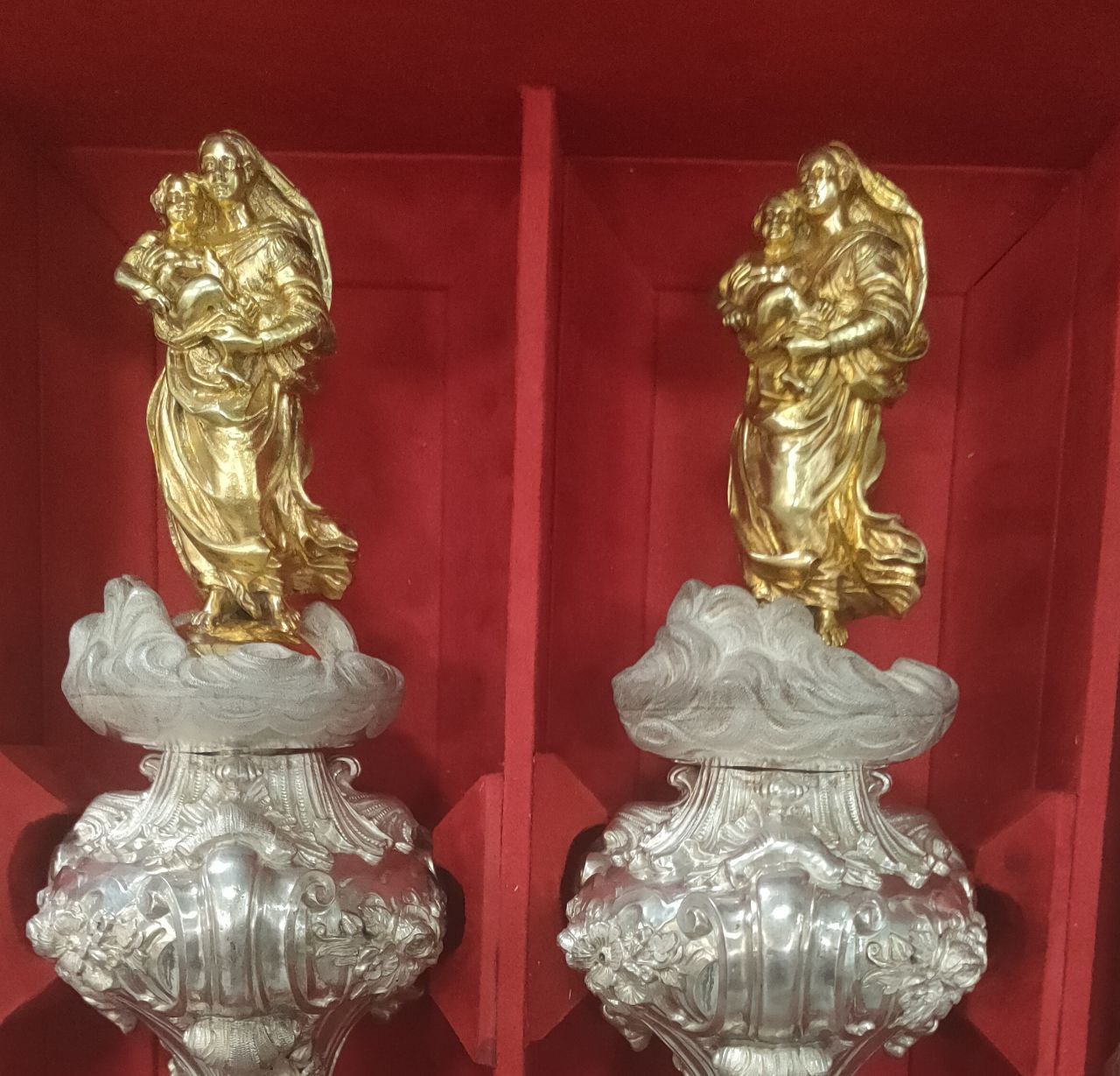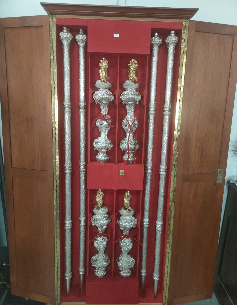 Du côté des autres objets – outre un beau chemin de croix en tableaux, complet, l’objet le plus rare est la série de quatre bâtons de procession en argent, à l’effigie de la Vierge Marie, conservés dans leur coffre d’origine où ils sont soigneusement sanglés. Voici la description de ce lot du XIXe : « quatre somptueux BATONS de PROCESSION en argent ciselé et doré à l’effigie de la Vierge Marie. Le tout de style baroque. Le fût ciselé et amati à décor de rameaux de lys supportant quatre bulbes ornés d’acanthes, de cotes torses surmontés de la Vierge à l’enfant en vermeil au sommet d’un nuage. Poinçon du maître orfèvre parisien Marie THIERRY, actif de 1853 à 1885. Conservé dans un coffre en bois de placage garni de feutre rouge sur mesure. Poids d’un bâton: 4000 gr Hauteur des bâtons : 215 cm. Boite : 187 cm, largeur 75 cm »