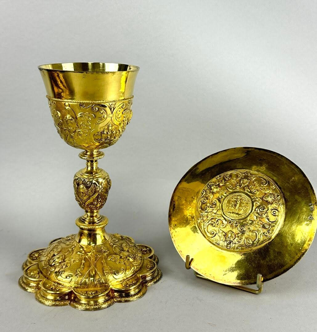 Le lot 9 est un calice breton en vermeil de la fin du XVIe siècle, jusque là dans une collection particulière du Morbihan, département où il a été produit voilà quatre siècles : « la base polylobée richement ornée de buste d’angelots, des instruments de la Passion, le noeud ovoïde à décor d’angelots et des symboles eucharistiques en rappel sur la fausse coupe alternés de symboles religieux (dont burette, trois vases sacrés). La PATENE centrée de la Crucifixion entourée de rinceaux et bustes d’angelots. Travail breton (Morbihan) de la fin du XVIe-début du XVIIe siècle« . Il est « représenté dans l’ouvrage « P. THOMAS-LACROIX, L’orfèvrerie religieuse en Bretagne : Morbihan, 1977″. Calice : Hauteur : 23,5 cm. Poids : 544 gr. Patène : 205 gr. Diam : 17 cm ».