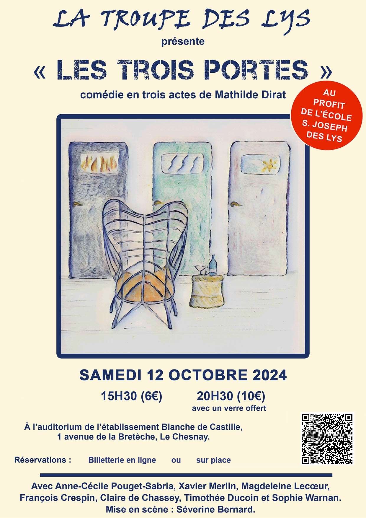 La Troupe des Lys, composée de parents et professeurs de l’Ecole et Collège Saint-Joseph-des-Lys (Versailles), vous invite à la pièce « Les trois portes « , comédie de Mathilde Dirat, à l’auditorium de Blanche de Castille (Le Chesnay) le samedi 12 octobre (au profit de l’école).