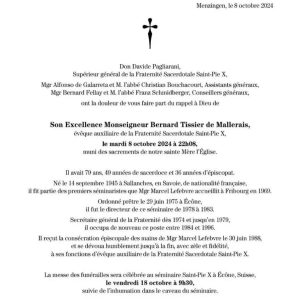 Mgr Tissier de Mallerais est décédé. La nouvelle est tombée à l’instant. Les funérailles auront lieu à Écône le vendredi 18 octobre à 9h30. Né en 1945, il avait été ordonné évêque en 1988.