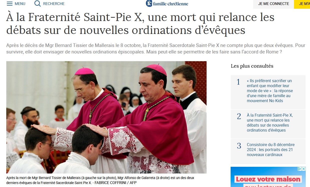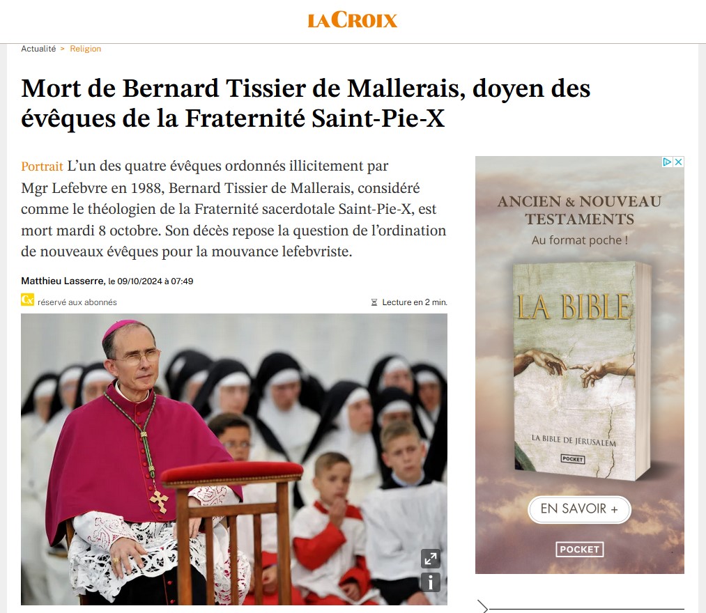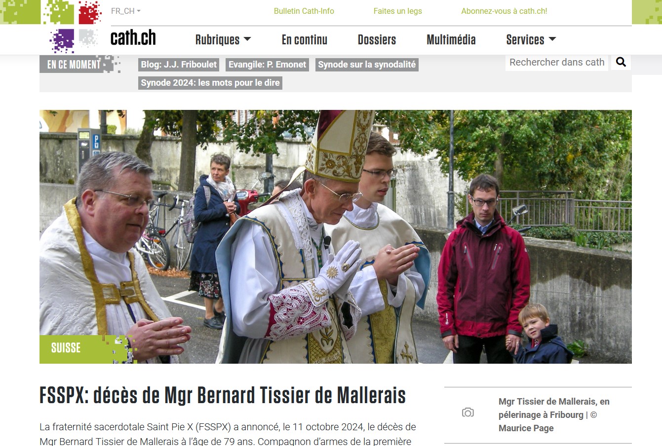 Accueil » Nos archives » Rappel à Dieu de Mgr Tissier de Mallerais Summorum Pontificum Rappel à Dieu de Mgr Tissier de Mallerais Suite au décès de Mgr Tissier de Mallerais, plusieurs médiats s’interrogent sur la suite que donnera la Fraternité Saint-Pie X et sur de potentielles nouvelles consécrations épiscopales qui sont évoquées depuis plusieurs mois : La Croix Famille Chrétienne Cath.ch L’Homme Nouveau Article précédentMaternité de la Sainte-Vierge (11 octobre) Article suivantÉcône: veillée funèbre et obsèques de Mgr Tissier de Mallerais 11 octobre 2024