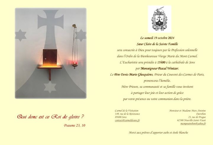 Sens dispose en outre d’une implantation de la FMND au nord de la ville, dans l’ancien couvent des années 1930 des Dominicaines de l’Eucharistie, sur la route de Saint-Clément, de l’ancienne maison mère des soeurs de la Providence de Sens – aujourd’hui maison de retraite, avec une communauté de soeurs âgées réduite, presque en face, et d’un Carmel dans le centre ancien. Le 19 octobre soeur Claire de la Sainte Famille a prononcé ses voeux perpétuels au Carmel en la cathédrale de Sens, en présence du nouvel archevêque.