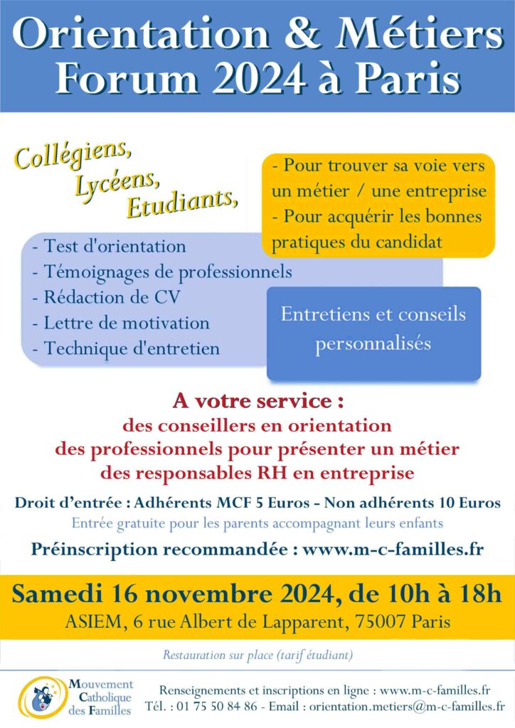 Pour nos jeunes, le Mouvement Catholique des Familles (MCF) propose son Forum Orientation & Métiers 2024 à Paris :