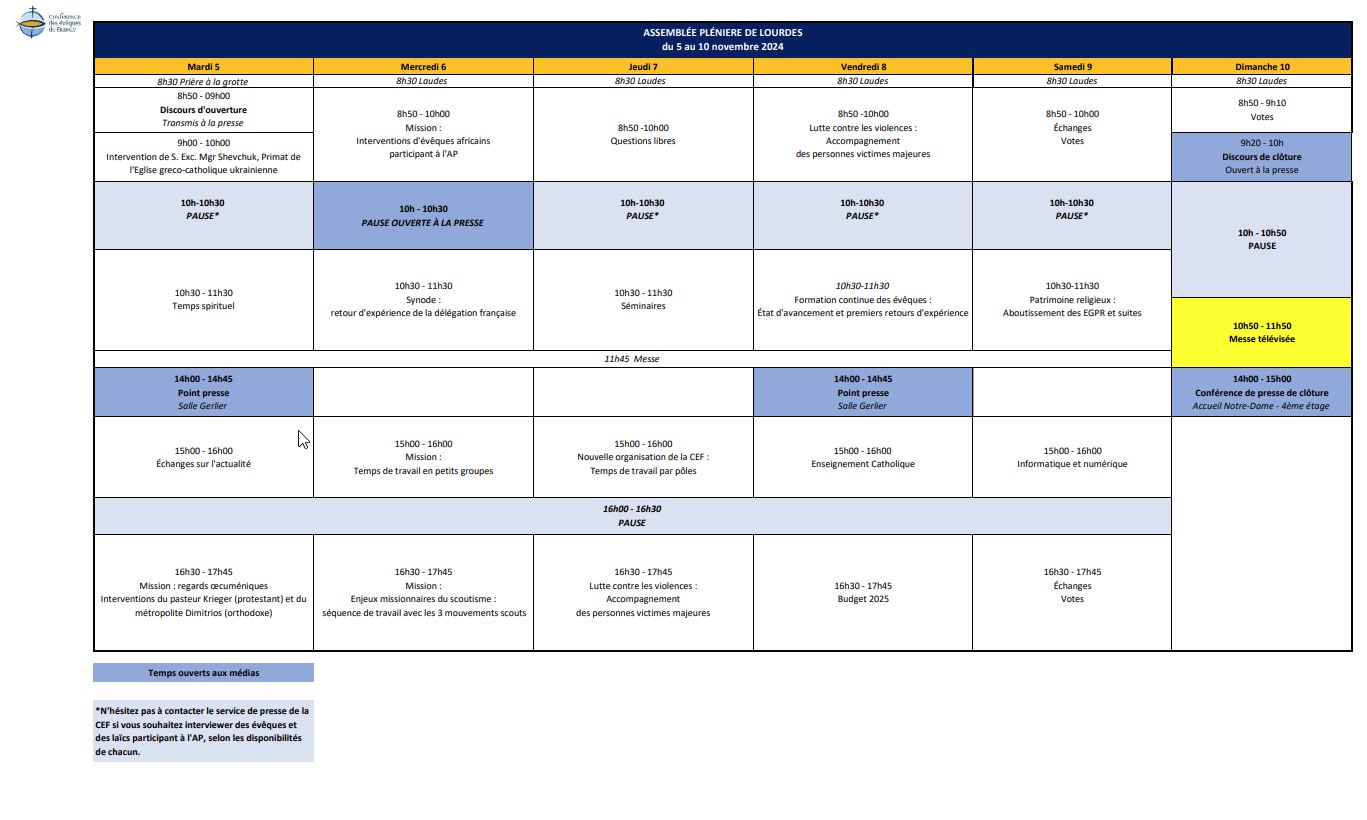 Le planning de l’assemblée plénière de la CEF (Conférence des évêques de France), du 5 au 10 novembre prochain, est paru. Il prévoit notamment plusieurs séances de travail sur la mission, et une intervention, dès le matin du premier jour, de Mgr Sviatoslav Schevchuk, Primat de l’Église greco-catholique ukrainienne – dont on espère qu’il abordera les persécutions que subissent actuellement les orthodoxes en Ukraine, auquel ce 17 octobre la cathédrale de Tcherkassy a été enlevée de vive force par une centaine d’hommes armés, après que la police ukrainienne ait quitté les lieux. En même temps, beaucoup plus discrètement, sont parus les quelques rendez-vous prévus pour la presse – en tout deux conférences de 45 minutes, le 5 et le 8 novembre à 14h, une pause « ouverte à la presse » le 6 novembre à dix heures – encore une petite demi-heure concédée, et une conférence de presse de clôture le 10 novembre à 14 h dans l’amphithéâtre au 5e étage de l’accueil Notre-Dame.