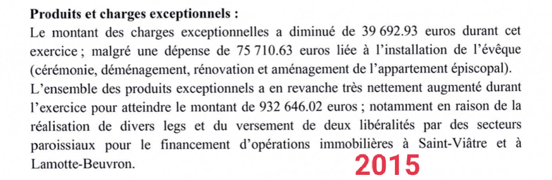 Dans le diocèse de Blois, les comptes en 2015 nous donnent la réponse à la page 14 – l’installation de Mgr Batut, mais aussi le « déménagement« , la « rénovation et aménagement de l’appartement épiscopal » ont coûté 75.710,63 euros, une somme pour ce petit diocèse qui n’a que 10 à 11 millions d’euros de réserves et dont le compte de résultat a été déficitaire sur l’exercice de 20.814 euros.