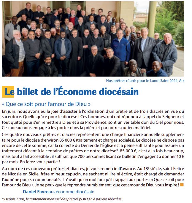 Dans le bulletin d’octobre, l’économe du diocèse d’Aix et d’Arles se réjouit de l’ordination d’un prêtre arrivé du Vietnam, Joseph Nguyen, et de trois diacres pour le diocèse, mais constate que le diocèse n’a pas la possibilité de leur assurer un traitement décent et appelle aux dons :