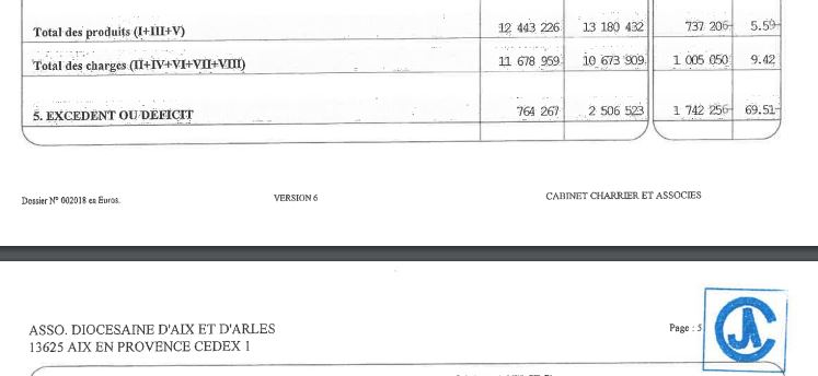 Néanmoins les comptes 2023 du diocèse d’Aix indiquent en 2023 un excédent plutôt correct de 764.267 euros, bien qu’il se soit réduit de deux tiers par rapport à 2022 (2.5 millions d’euros). Le diocèse, qui englobe les deux tiers des Bouches-du-Rhône, d’Aix jusqu’à Arles et Istres, dispose de réserves pour 20 millions d’euros (page 22), ainsi que 10.9 millions d’euros de fonds propres sans droit de reprise, et 2.4 millions avec droit de reprise … En face, il y a 1.7 millions d’euros d’emprunts auprès d’établissements de crédit, en baisse, 1.6 millions d’euros d’emprunts divers, 1.1 millions d’euros d’autres dettes, 945.000 euros de dettes provenant des legs et des donations, 233.000 euros de dettes fournisseurs, 200.000 euros de dettes fiscales et sociales, soit 5.9 millions d’euros de dettes de toutes natures.