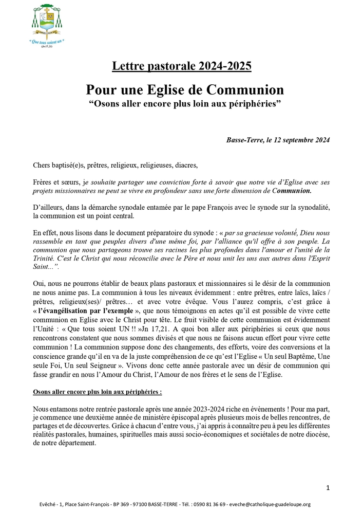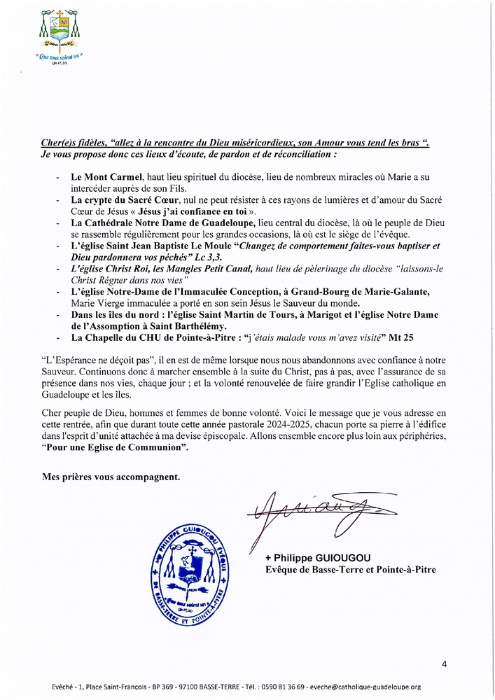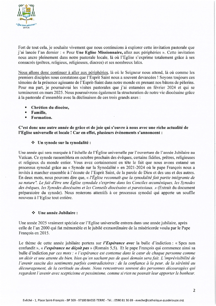 Le diocèse de Basse-Terre communique : « en cette année Jubilaire souhaitée par le pape François sur le thème de l’Espérance, le pasteur de notre diocèse a fixé ses priorités : Les jeunes et l’indulgence (la miséricorde). Parallèlement, Mgr Philippe GUIOUGOU invite les fidèles, les paroisses, les communautés, mouvements, et pour faire simple, notre Eglise catholique en Guadeloupe dans toutes ses composantes, à aller encore plus loin aux périphéries ».