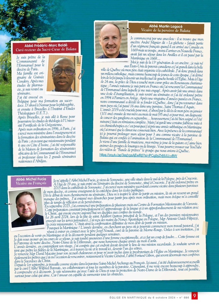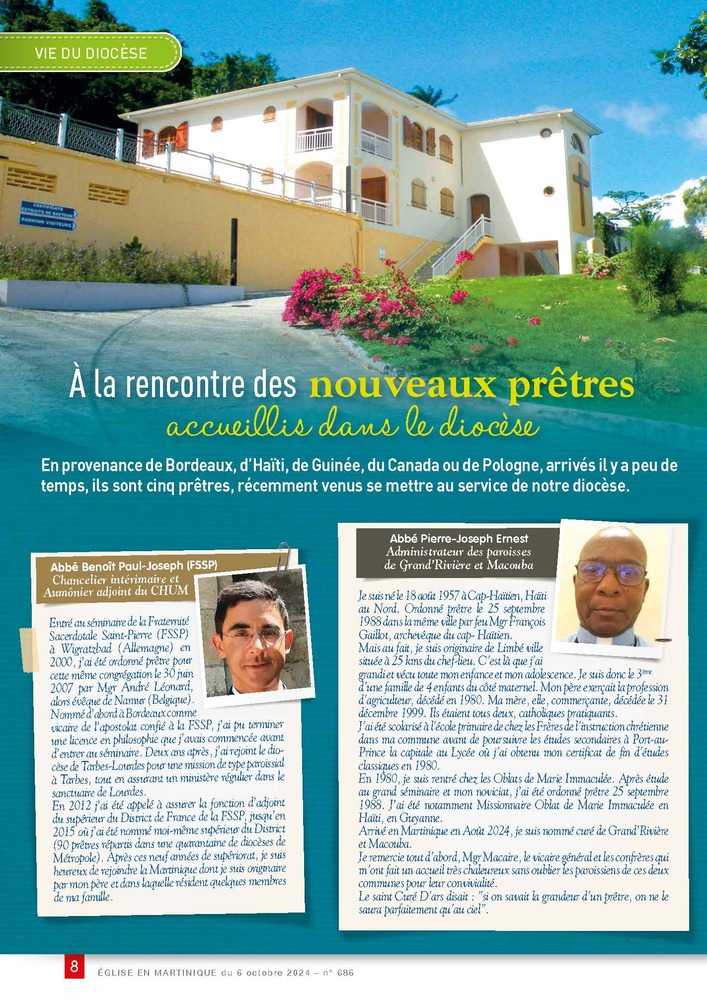Le diocèse de Fort-de-France publie dans son bulletin les portraits concis des cinq nouveaux prêtres qui viennent se mettre à son service – parmi eux, l’ex supérieur du district de France de la FSSP, l’abbé Benoît Paul-Joseph, « heureux de rejoindre la Martinique dont je suis originaire par mon père et où résident quelques membres de ma famille« . Il y a aussi un prêtre des Oblats de Marie Immaculée d’Haïti – jadis en poste en Guyane, dans le diocèse de Cayenne que sa congrégation a du quitter à la demande de Mgr Ransay, un prêtre de l’Emmanuel du diocèse de Paris originaire de Guinée-Conakry, un autre prêtre de l’Emmanuel originaire du Québec ordonné en 1994 à Pamiers, qui a été en poste en France et au Québec avant de faire une année sabbatique en Martinique, et un missionnaire polonais, ordonné en 2015 à Cracovie.