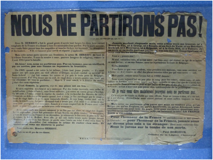 En août 1914, le gouvernement suspend les lois anti-congrégationnistes de 1901 et 1904 pour permettre le retour des exilés, ainsi ce sont plus de 9000 religieux qui seront mobilisés pendant la Grande Guerre (Plus de 1500 perdront la vie, 1200 seront blessés). Mais en juin 1924, le président du Conseil, Edouard Herriot rétablit ces lois iniques entrainant notamment l’expulsion des Congrégations. Quelques mois plus tard, RP Paul Donceur, jésuite et aumônier militaire plusieurs fois décorés, remonte au front avec cet appel historique « Pour l’honneur de la France, nous ne partirons pas » tiré à 100 000 exemplaires.