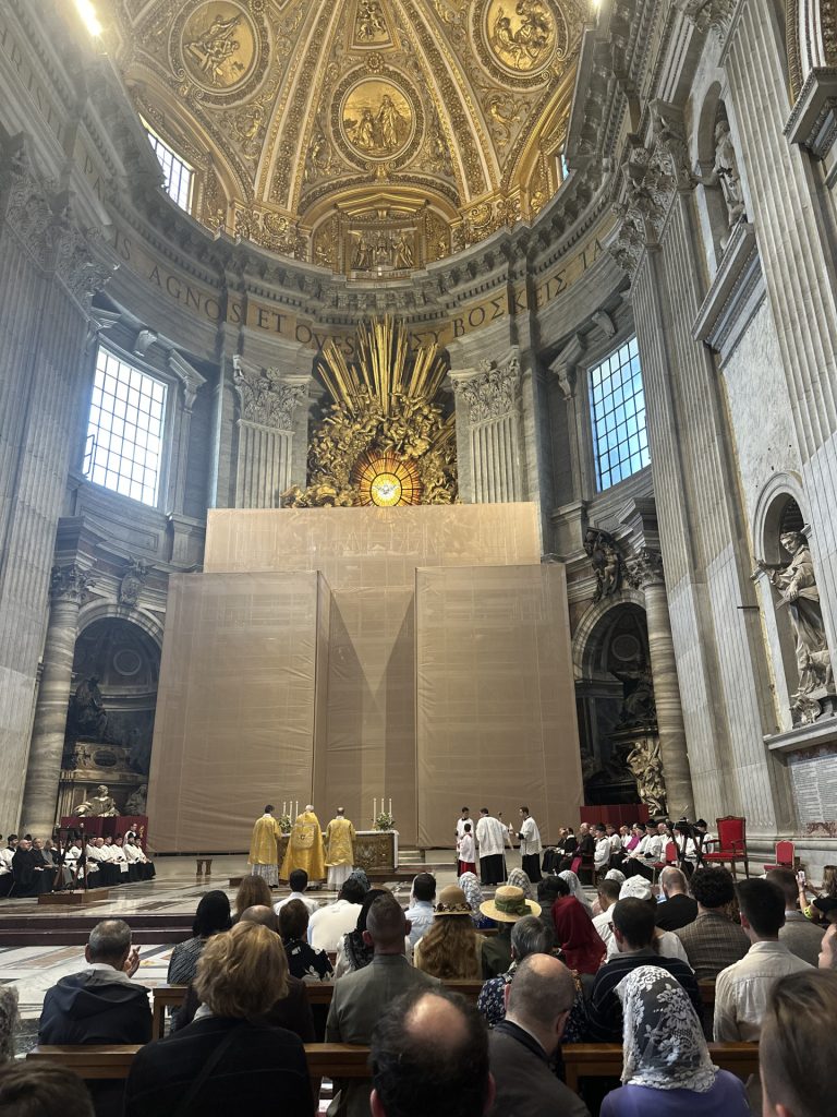 Après l’entrée des pèlerins à Saint-Pierre de Rome, puis vénération des reliques devant la tombe de saint Pierre, les pèlerins se sont rendus en direction de l’autel de la chaire de saint-Pierre. Même si l’autel n’est pas visible en raison de travaux, les fidèles ont pu s’y rendre pour écouter la prédication du cardinal Müller qui a appelé à fonder sa vie sur le roc du Christ. Un salut au Saint-Sacrement a ensuite eu lieu.