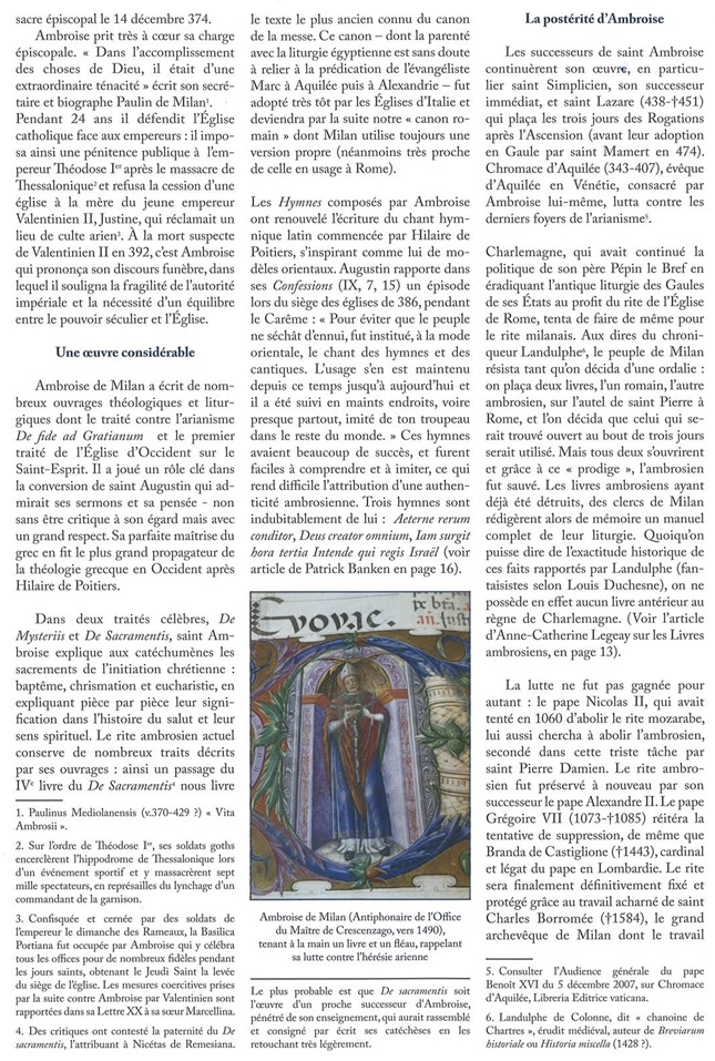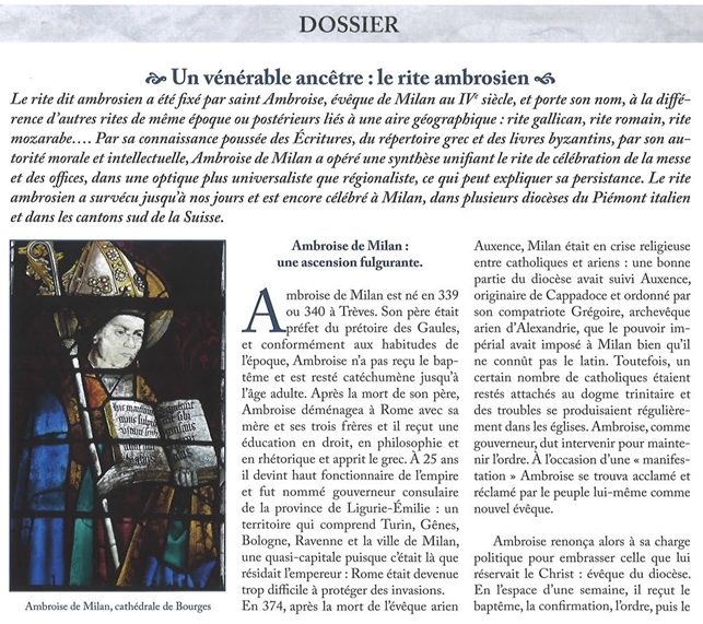 La liturgie que nous allons vous présenter a été effectivement fixée, au IV’ siècle, par l’évêque saint Ambroise de Milan. Le parcours étonnant de ce converti tardif et sa contribution capitale à l’unification du rite de la messe et des offices catholiques ont fort impressionné saint Augustin d’Hippone. La production de livres liturgiques ambrosiens honore des bibliothèques prestigieuses, dont celle de Solesmes, et bien des détails sont toujours en vigueur dans les diocèses du Piémont italien. Or la façon dont nos pères ont prié pendant des siècles reste notre référence.