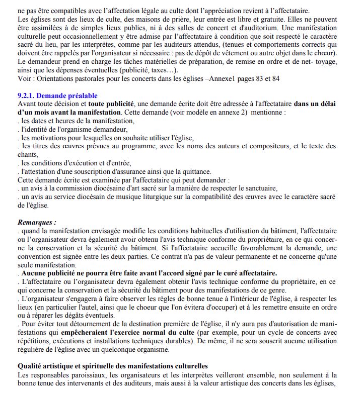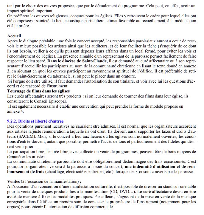[Lors des demandes de tournages] les curés affectataires seront très prudents : si on leur demande de tourner des films dans leur église, ils consulteront le Conseil Episcopal. Il est également nécessaire d’établir une convention […] Des opérations purement lucratives ne sauraient être admises. Il est normal que les organisateurs accordent aux artistes la juste rémunération à laquelle ils ont droit. Ils doivent aussi supporter les taxes et droits d’auteurs (SACEM). Mais, si le concert a lieu aux heures où les églises sont normalement ouvertes, les conditions d’entrée doivent, autant que possible, permettre l’accès de tous et particulièrement des fidèles qui désirent venir prier« .