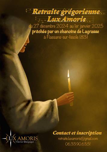 Le Chœur Lux Amoris vous invite à la 6e édition de sa retraite grégorienne à Flassans-sur-Issole (83), à destination des étudiants et jeunes pro (18 à 35 ans), qui aura lieu du 27 décembre 2024 au 1er janvier 2025. La retraite est rythmée quotidiennement par le chant des Offices Liturgiques (Laudes, Messes, Vêpres et Complies) et est prêchée par un Chanoine de Lagrasse.