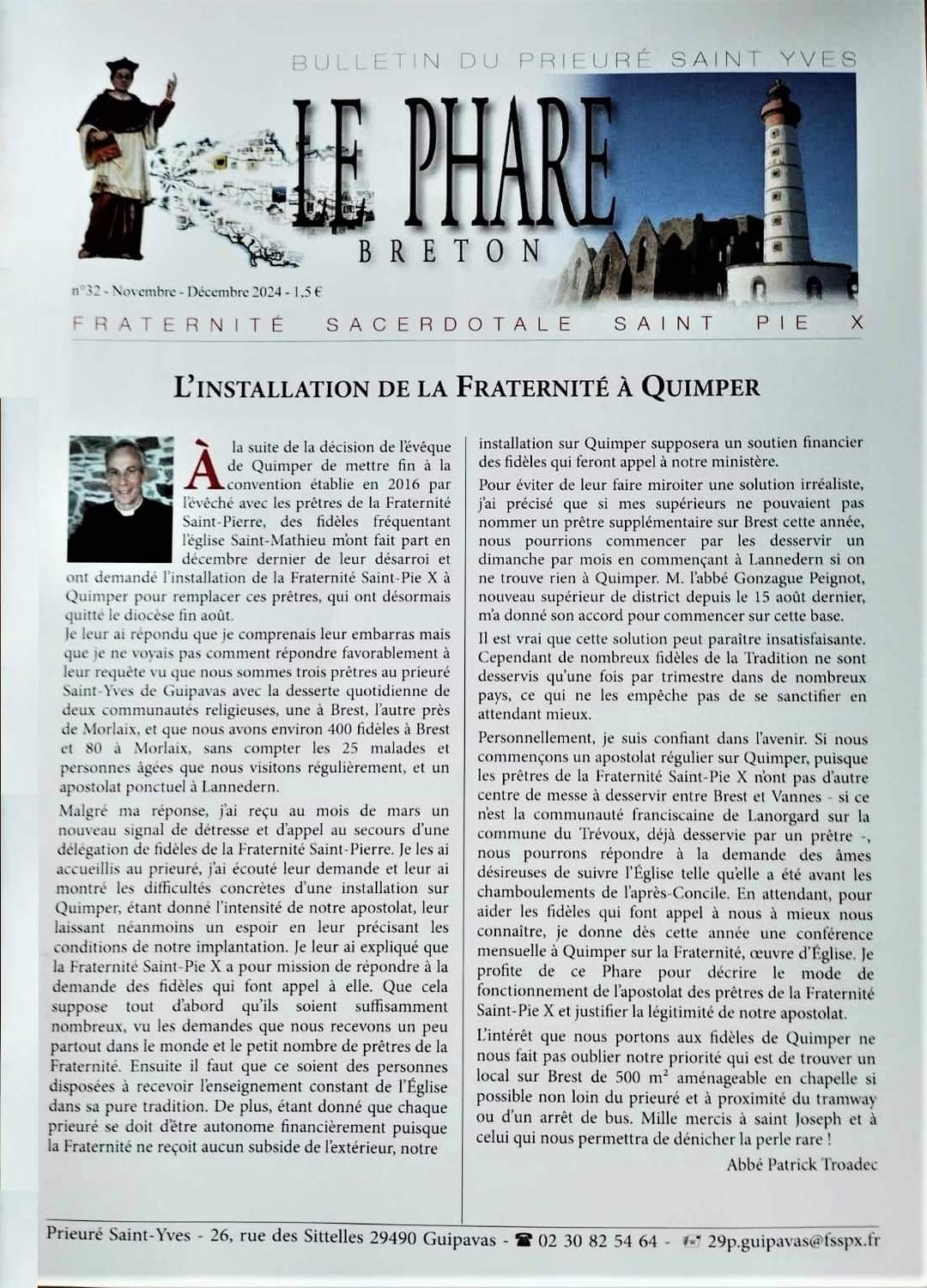 Ces jours-ci (dans son bulletin Le Phare breton, n°32, Novembre-Décembre 2024), la Fraternité Saint-Pie X vient d’annoncer qu’elle va desservir, dans un premier temps, une fois par mois Quimper, et, que si elle ne trouvait pas de lieux approprié, elle desservirait Lannedern (45 km au nord de Quimper).