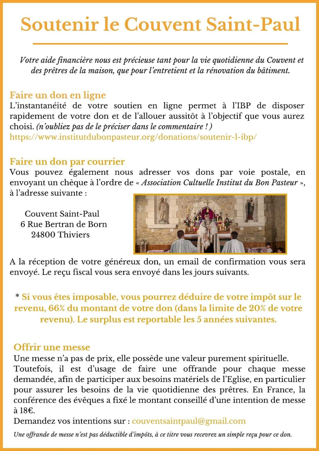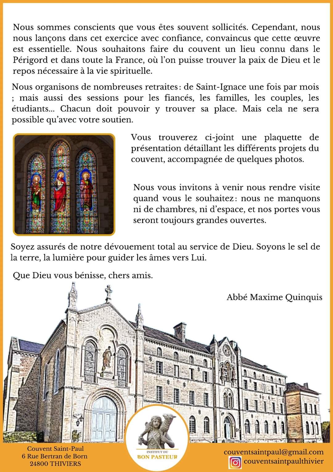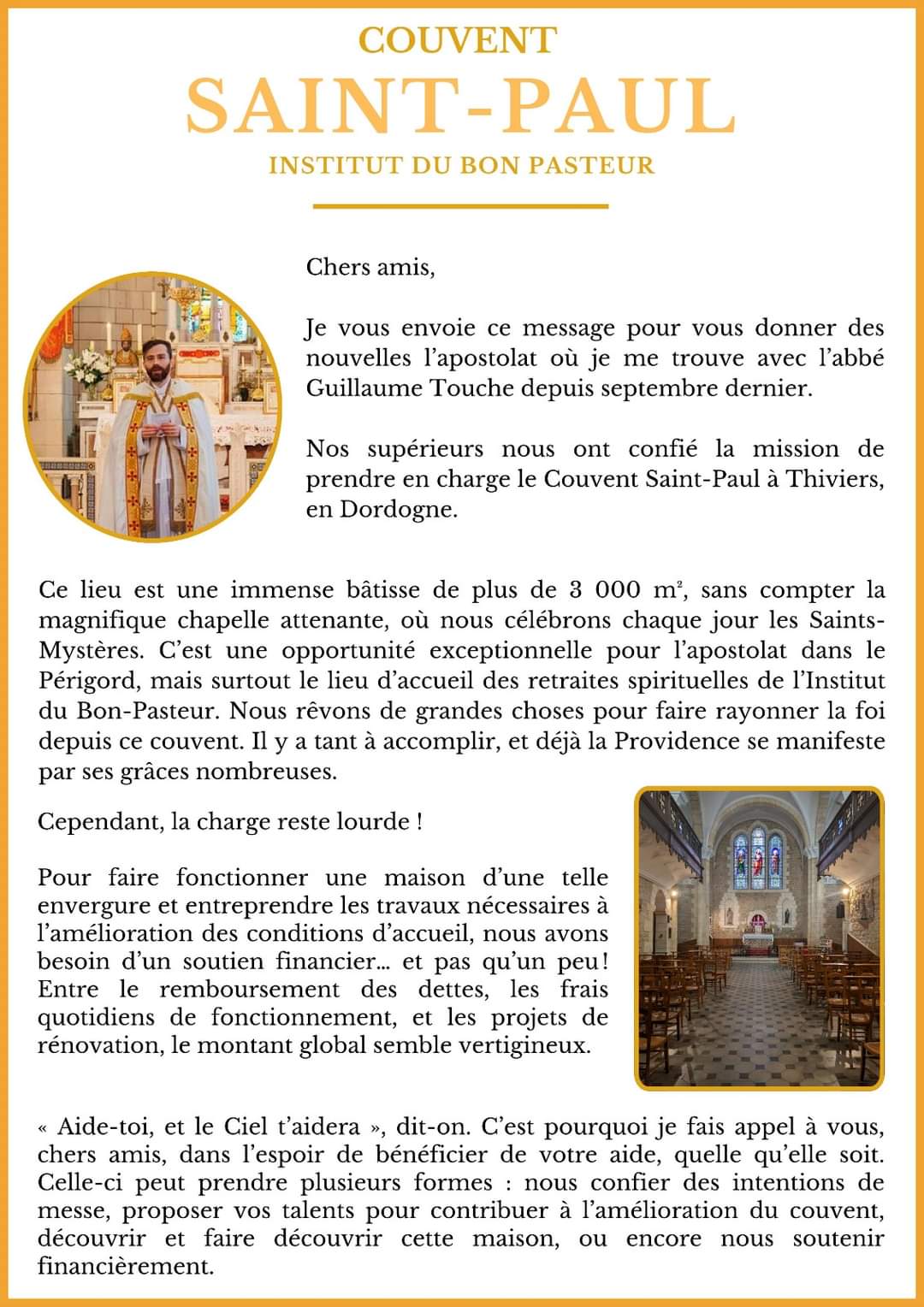 Le Couvent Saint-Paul à Thiviers (24) abrite la maison où sont notamment prêchées les retraites spirituelles par les prêtres de l’Institut du Bon Pasteur (Exercices spirituels de Saint-Ignace une semaine par mois).