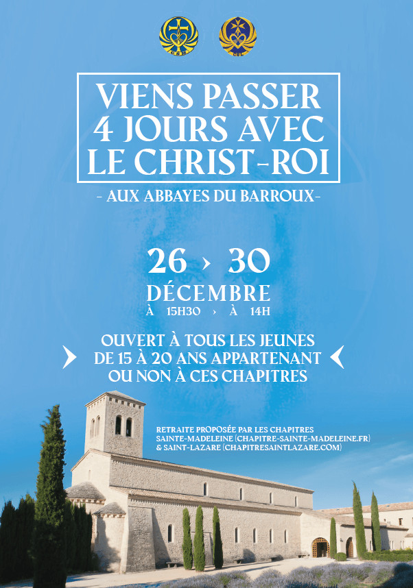 Les Chapitre Sainte Madeleine et Chapitre Sainte Lazare proposent aux jeunes de 15 à 20 ans une retraite spirituelle du 26 au 30 décembre aux Abbayes du Barroux (Sainte Madeleine (bénédictins) et Notre-Dame de l’Annonciation (bénédictines)) sur le thème du Christ-Roi. Conférences, offices en grégorien (messe traditionnelle), entretiens possibles avec un prêtre ou une moniale, travail possible avec les moines ou les moniales.