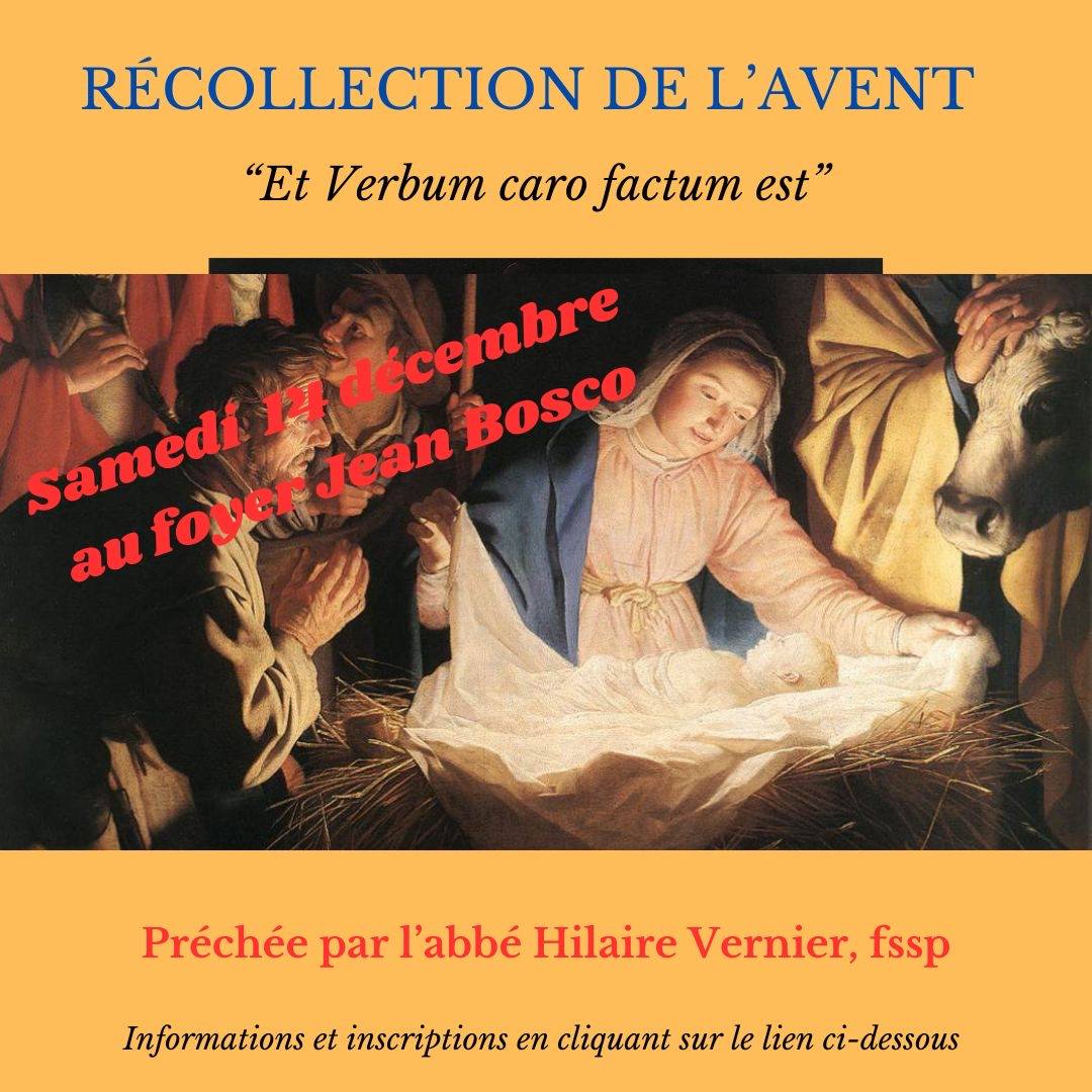 La récollection a lieu le 14 décembre à Paris 16è et est prêchée par l’abbé Hilaire Vernier, FSSP, sur le thème « Et Verbum caro factum est »