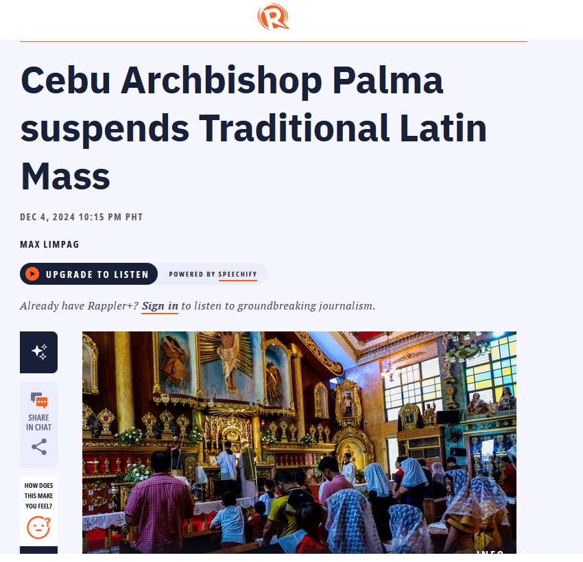 La suspension a été annoncée dans une lettre de Monseigneur Renato Beltran, chancelier de l’archidiocèse de Cebu, au nom de Mgr Palma. La lettre était adressée à la communauté de la messe latine et aux trois prêtres autorisés par Mgr Palma à célébrer la forme extraordinaire de la messe à Cebu : Mg Joseph Tan, le père Andrei Ventanilla et le père Luigi Kerschbamer. La lettre, datée du 28 novembre, a été rendue publique le lundi 2 décembre par Pio Gerard Fulache Antiquina, directeur de la communauté de la messe latine de Cebu.