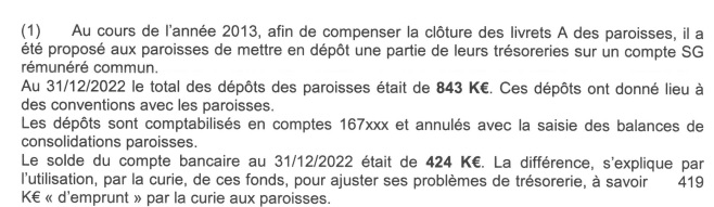 Le diocèse est aussi plombé par des affaires anciennes – ainsi, la créance de l’abbé Videau, ex-économe du diocèse de 1986 à 2004 condamné en 2010 à trois ans de prison ferme (huit mois ferme en appel en 2011) pour avoir détourné jusqu’à 2 millions d’euros au préjudice du diocèse et du legs de Mgr Arrighi, court toujours – en 2015, elle avoisinait le million d’euros, et on la retrouve dans les comptes 2023, rangée dans les créances pour un montant 1.009.080.67 euros, puis dans les provisions pour dépréciations (page 10).