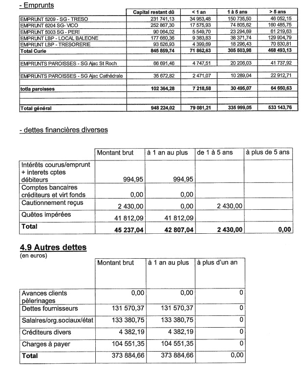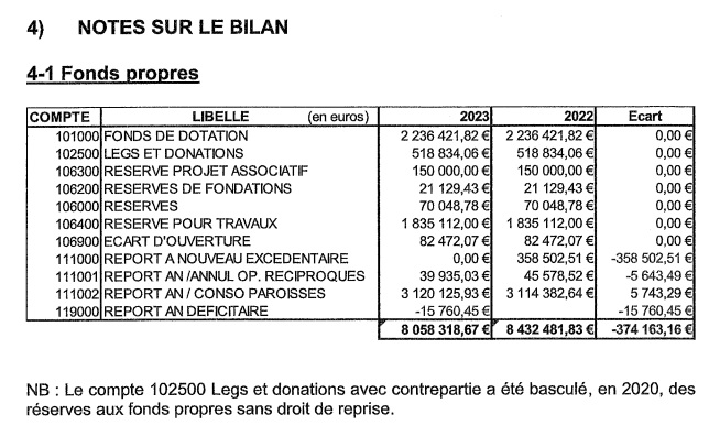 Néanmoins les comptes 2023 du diocèse d’Ajaccio montrent une solide amélioration : 708.494 euros de bénéfice, contre un déficit de 374.262 euros en 2022 et 13.0002 euros de déficits en 2021. Il y a aussi des fonds propres assez faibles – en tout, 8 millions d’euros (page 27), dont 2.7 millions d’euros sans droit de reprises, 2.1 millions d’euros d’autres réserves, mais aussi 949.000 euros d’emprunts auprès d’établissements de crédit, 44.242 euros d’emprunts divers, 109.000 euros de dettes fournisseurs, 133.000 euros de dettes fiscales et sociales, 108.000 euros d’autres dettes…