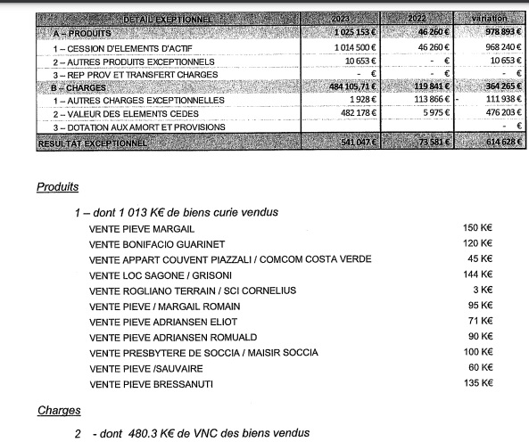 Dans les faits significatifs de l’exercice (page 26), le commissaire aux comptes relève aussi le décès de l’économe diocésain Patrick Bouis et l’embauche de Mme Rodeville-Pelletier pour le remplacer, l’audit général du diocèse début 2023, le redémarrage du projet de nouvelle église à Porticcio avec un nouvel architecte – le précédent, d’un coût de 2 millions d’euros, était hors de portée financière du diocèse, seuls 848.000 euros figurent actuellement dans le « fonds dédié Porticcio » (page 28).