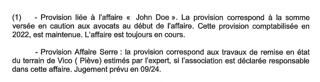 On relève encore parmi les 28.722 euros de provisions pour risque une étonnante « provision John Doe » et une autre liée à un litige quant à la remise d’un état à Vico. On retrouve page 37 cette affaire orthographiée différemment (affaire John Doh) avec « 6.4 kE d’honoraires liés à l’affaire John Doe contre 33 kE en 2022 » et « 20 kE de provisions pour risque et charges liées à l’affaire Serre, contre 51K en 2022 (affaire John Doh)« .