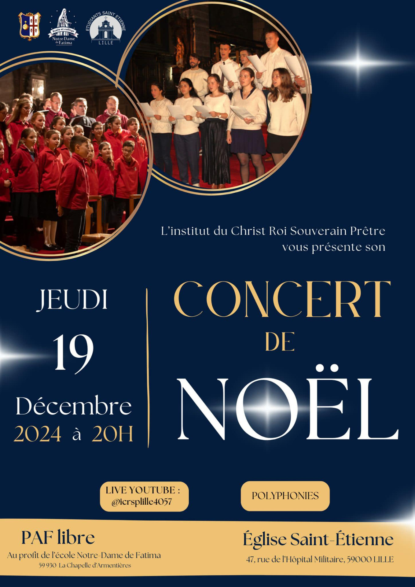 La chorale des élèves de l’école Notre-Dame de Fatima (La Chapelle d’Armentières) et le choeur des étudiants de Saint-Etienne vous invite à leur concert de Noël ce jeudi 19 décembre à 20h00 à l’église Saint-Etienne (47 rue de l’Hôpital Militaire) à Lille. Le Concert est au profit de l’Ecole Notre-Dame de Fatima.
