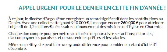 La dernière lettre d’information du diocèse d’Angoulême en 2024 – en date du 18 décembre – alerte sur le retard de la collecte du denier, il manque 260.000 euros par rapport à l’objectif d’1.2 millions d’euros, soit plus du quart.