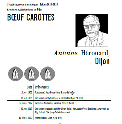 Et Golias de désigner les prochaines cibles, comme à la foire, ou dans le bureau du nonce : « on l’a dit, Antoine Hérouard s’ennuie. Il attend plutôt le moment où Rome l’enverra effectuer une visite amicale à un évêque problématique. Pourquoi pas à Olivier de Germay à Lyon, Yves Le Saux à Annecy, Xavier Malle à Gap, Vincent Dollmann à Cambrai ? On en oublie sûrement… Ne doutons pas qu’ils goûteront tous l’amitié de « Boeuf-Carottes » !«