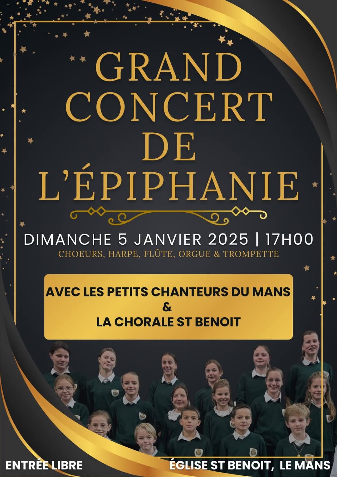 Accueil » Nos archives » Concert de l’Epiphanie ce 5 janvier au Mans Summorum Pontificum Concert de l’Epiphanie ce 5 janvier au Mans Un concert de l’Epiphanie aura lieu de dimanche 5 janvier à 17h00 à l’église Saint Benoit du Mans : FSSP Sarthe Article précédentDijon : Golias se paie Mgr Boeuf-Carottes Article suivantL'affaire Santier aurait-elle pu sortir plus tôt ? 3 janvier 2025
