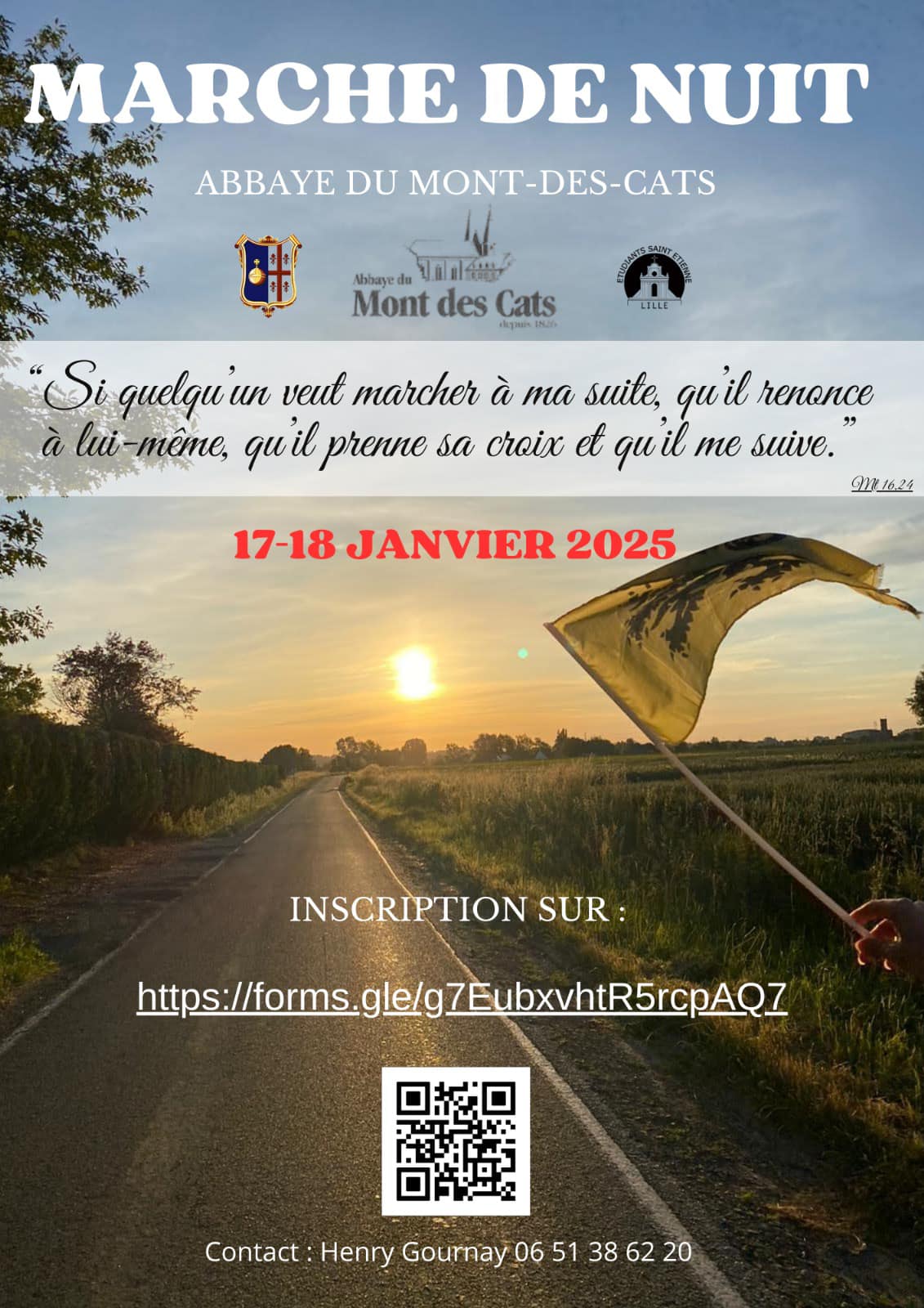 Marche de nuit du 17 au 18 janvier (37 km) de l’église Saint-Etienne (Lille) à l’abbaye du Mont des Cats pour étudiants et jeunes pro, mais aussi pour père ou mère de famille un peu sportif, lycéens… en présence d’un chanoine de l’Institut du Christ Roi.