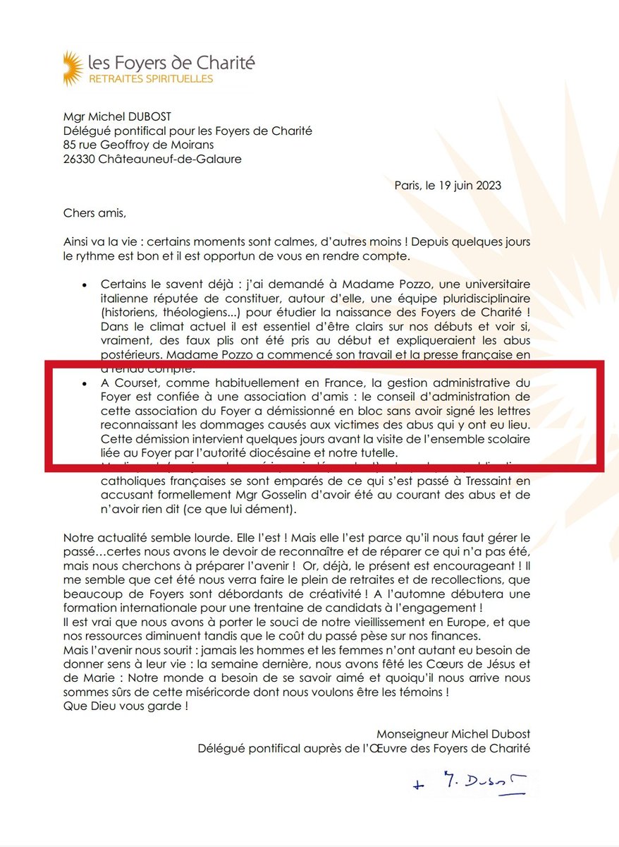 Dans certains foyers, comme à Courset en 2023, l’association des Amis préfère démissionner en bloc au lieu de reconnaître les dommages liés aux abus, quelques jours avant le passage de Mgr Dubost et de l’autorité du diocèse d’Arras :
