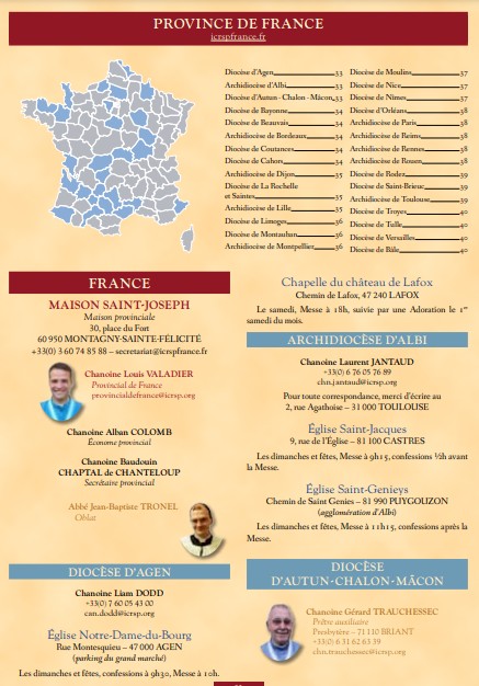 Ce calendrier récapitule aussi les différents apostolats confiés à l’Institut dans le monde.