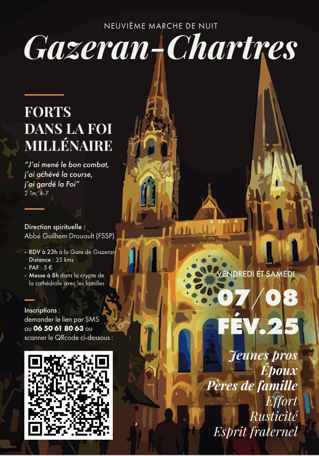 L’abbé Guilhem Drouault, FSSP, assurera la direction spirituelle de cette marche et sera entouré de plusieurs abbés pour confesser et nous faire méditer. Le thème de l’année est : Fort dans la Foi millénaire. Nous prévoyons des vivres solides, café, thé et vin chaud au cours de deux pauses. Le rdv est fixé à 23h00 vendredi 7 février à la Gare de Gazeran pour un départ à 23h30.