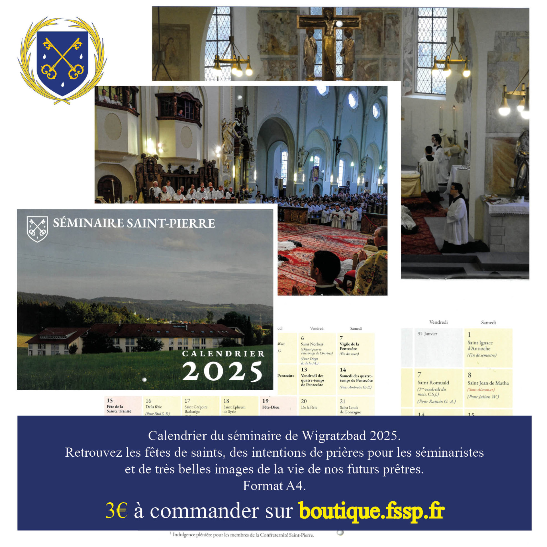 Accueil » Nos archives » Commandez le calendrier du Séminaire Saint-Pierre (FSSP) Summorum Pontificum Commandez le calendrier du Séminaire Saint-Pierre (FSSP) Le Séminaire Saint-Pierre à Wigratzbad (FSSP) vous propose son calendrier annuel 2025. A commander sur la boutique de la Fraternité Saint-Pierre ! Boutique FSSP Article précédentNotre-Dame de Pontmain (17 janvier) Article suivantAgenda : Pèlerinage de Nuit vers Chartres du 7 au 8 février 17 janvier 2025