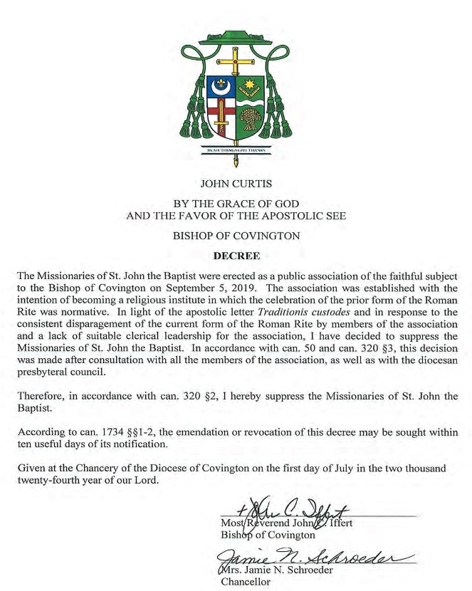 Par conséquent, conformément au canon 320 §2, je supprime par la présente les Missionnaires de Saint Jean le Baptiste.Conformément au can. 1734 §§1-2, la modification ou la révocation de ce décret peut être demandée dans les dix jours utiles de sa notification,Donné à la chancellerie du diocèse de Covington le 1er juillet de 2024 de Notre Seigneur.