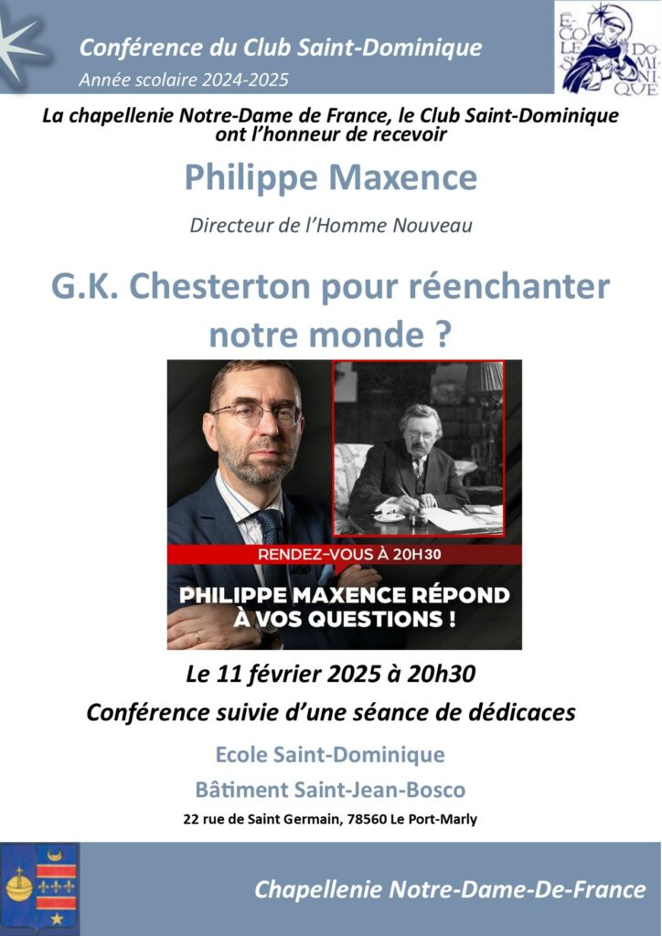 Une conférence du Club Saint-Dominique et de la Chapellenie Notre-Dame de France (Port-Marly) vous invite à une conférence de Philippe Maxence : « G.K. Chesterton pour réechanter notre monde ? » le 11 février