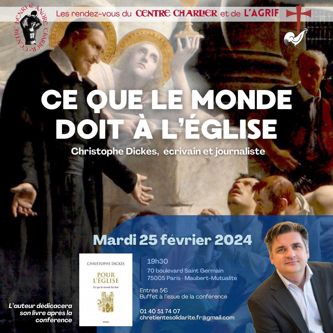 Accueil » Nos archives » Conférence de Christophe Dickès à Paris le 25 février Summorum Pontificum Conférence de Christophe Dickès à Paris le 25 février Le Centre Charlier (Paris) organise une conférence de Christophe Dickès : « Ce que le monde doit à l’Eglise » le mardi 25 février 2025 à 19h30 Centre Charlier Article précédentMarseille : le diocèse vend l'église de Pont de Vivaux Article suivant70 ans de l’Ordinariat des catholiques orientaux 3 février 2025