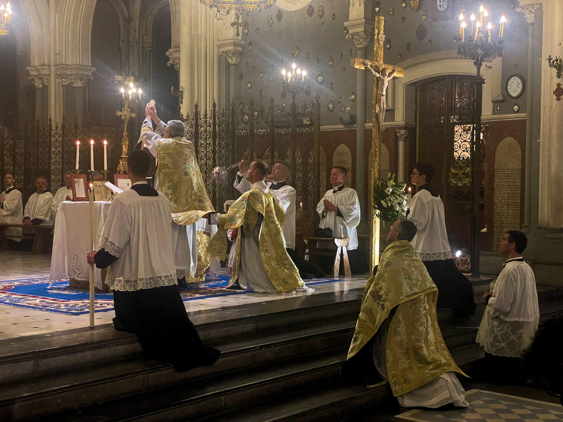 Le Conseil Général de la Fraternité Sacerdotale Saint-Pierre, accompagné d’autres membres représentant la Fraternité à travers le monde, s’est réuni à Lourdes pour renouveler la consécration solennelle de la communauté au Cœur immaculé de Marie. En préparation de cet acte, les prêtres présents ont participé à la procession aux flambeaux le lundi 10 février au soir et ont passé la nuit en adoration dans la chapelle de l’Hospitalet. Le soir de la fête de Notre-Dame de Lourdes, 11 février, après une journée de pèlerinage et de prière en ces lieux saints, une messe solennelle d’action de grâce a été célébrée par l’abbé John Berg dans la basilique supérieure. Dans son sermon, l’abbé Vincent Ribeton évoqua « la mémoire des grâces reçues le 11 février 2022, à tout jamais inscrite en nos âmes ». Les prêtres et les fidèles des apostolats locaux se sont ensuite rendus en procession, face à la grotte, pour renouveler l’acte de Consécration.