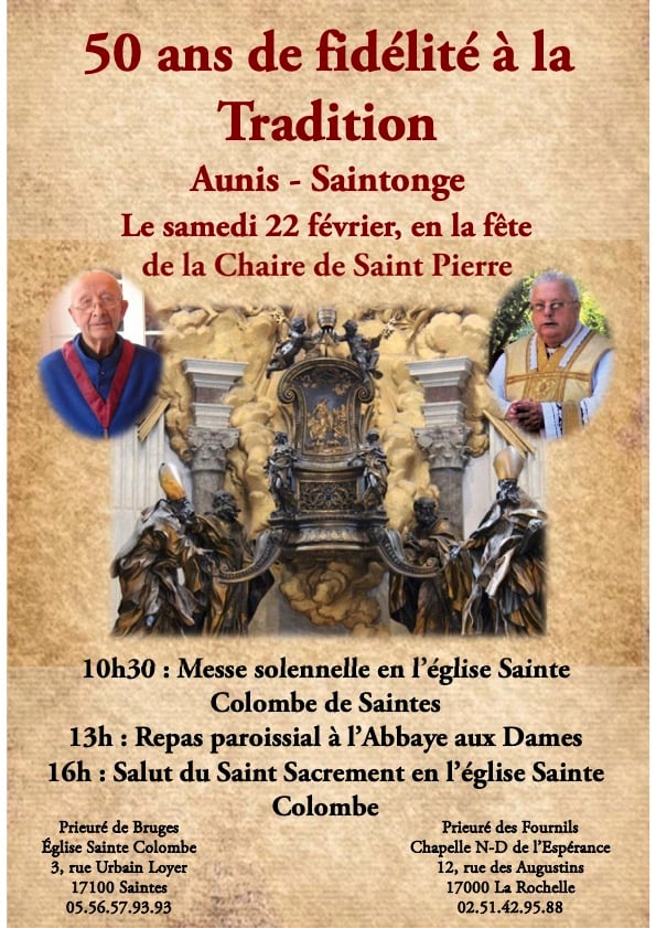 Accueil » Nos archives » 50 ans de Tradition en Charente-Maritime le 22 février En Une 50 ans de Tradition en Charente-Maritime le 22 février Samedi 22 février en la fête de la Chaire de Saint Pierre, la FSSPX fêtera les 50 ans de Tradition en Charente-Maritime avec une messe d’action de grâce : Article précédentSanté du pape : une pneumonie bilatérale Article suivantSaint-Brieuc : nouvel économe diocésain fin mars 19 février 2025