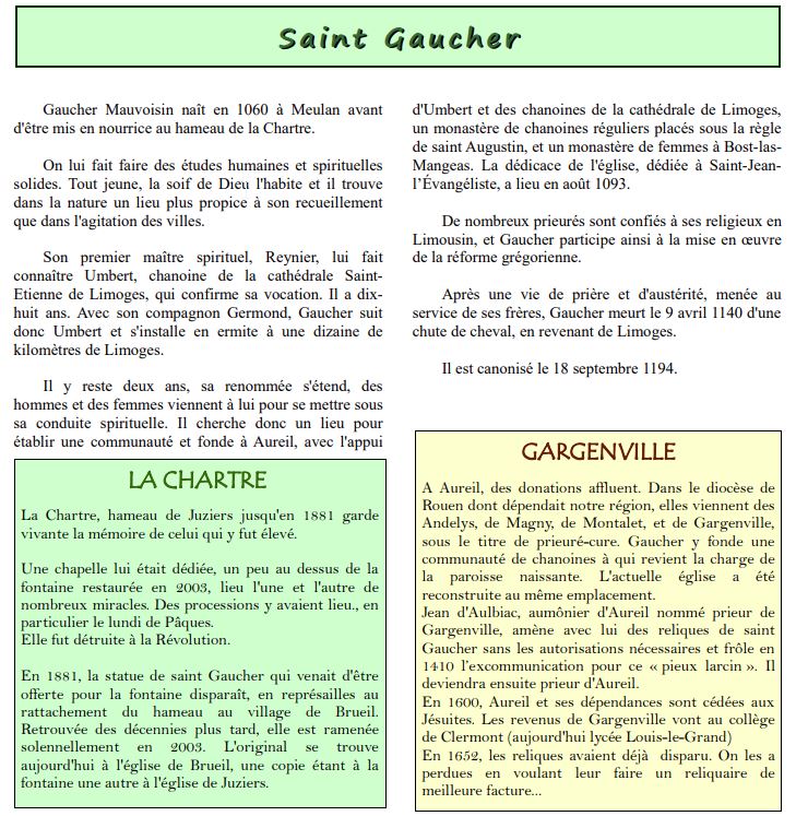 Le 15 février dernier Mgr Bozo est venu de Limoges mettre solennellement une relique de saint Gaucher dans le buste-reliquaire de l’église de Gargenville dans le diocèse de Versailles, d’où la relique avait été subtilisée… au XVe siècle par un moine alors excommunié. Saint Gaucher est un saint local du diocèse de Versailles, né en 1060 à Meulan et décédé en 1140 – il est canonisé en 1194. Il connaît sa vocation à 18 ans au diocèse de Limoges, qui conserve toujours ses reliques.