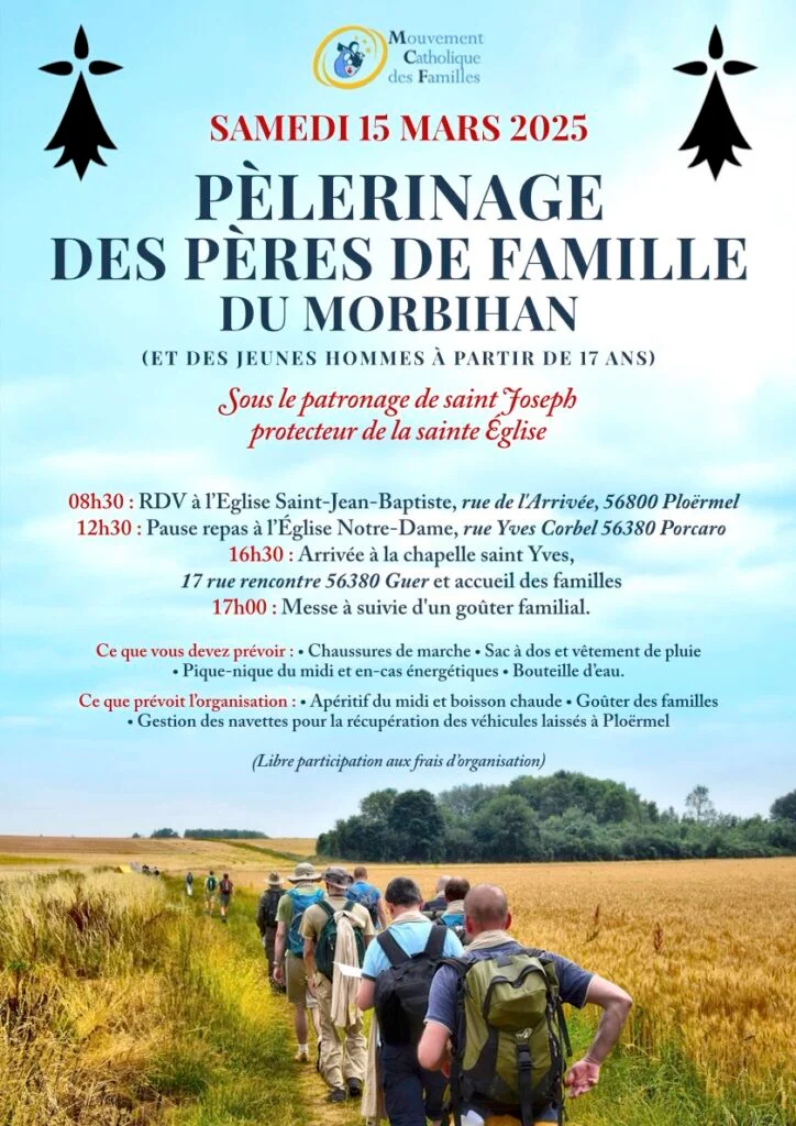 Accueil » Nos archives » Pèlerinage des pères de famille du Morbihan le 15 mars Summorum Pontificum Pèlerinage des pères de famille du Morbihan le 15 mars Le Mouvement catholique des familles (MCF) organise un Pèlerinage des Pères de famille le 15 mars 2025 de Ploërmel à Guer (Aumônerie FSSPX). Article précédentRennes : le diocèse recrute un communicant et un directeur de l'enseignement catholique Article suivantChâteauroux : l'ancien directeur adjoint du collège Léon XIII visé par 74 plaintes 22 février 2025