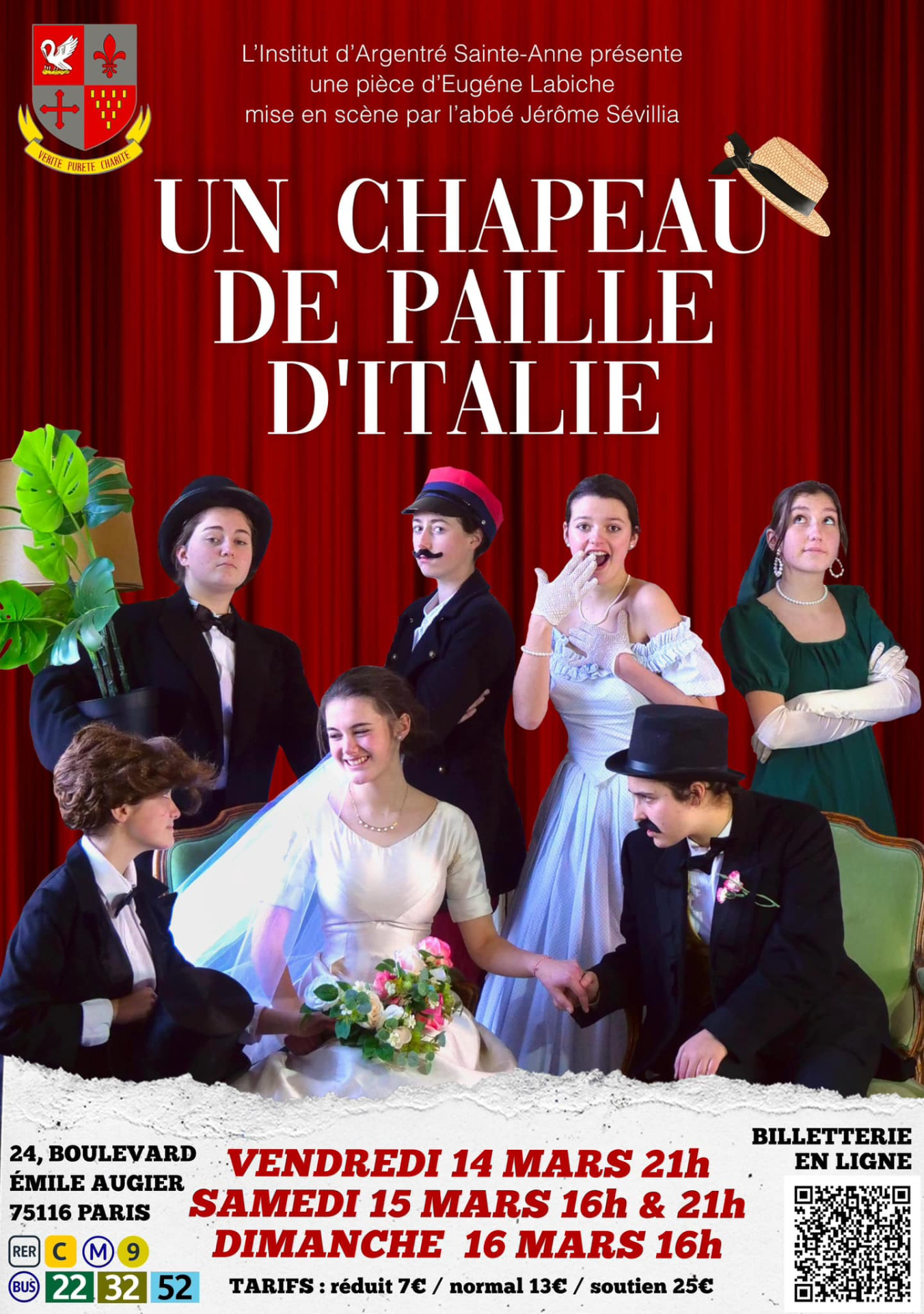 Nos élèves de la classe de première vous proposent 4 représentations de la pièce « Un chapeau de paille d’Italie » d’Eugène Labiche. Mise en scène par l’abbé Sévillia, notre aumônier, nous vous attendons dans une salle magnifique au 24, boulevard Émile Augier dans le 16e arrondissement de Paris vendredi 14 mars (21h), samedi 15 mars (16h et 21h) et dimanche 16 mars (16h).
