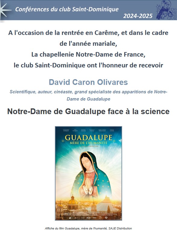 La Chapellenie Notre-Dame de France (Eglise Saint- Louis du Port-Marly) et l’Ecole Saint Dominique (Le Pecq) organisent une conférence intitulée « Notre-Dame de Guadalupe face à la science » de David Caron Olivares le jeudi 6 mars 2025 à 20h30 à l’école Saint-Dominique (Grande Salle Bâtiment Saint-Jean-Bosco, 22 rue de Saint Germain, 78560 Le Port-Marly).