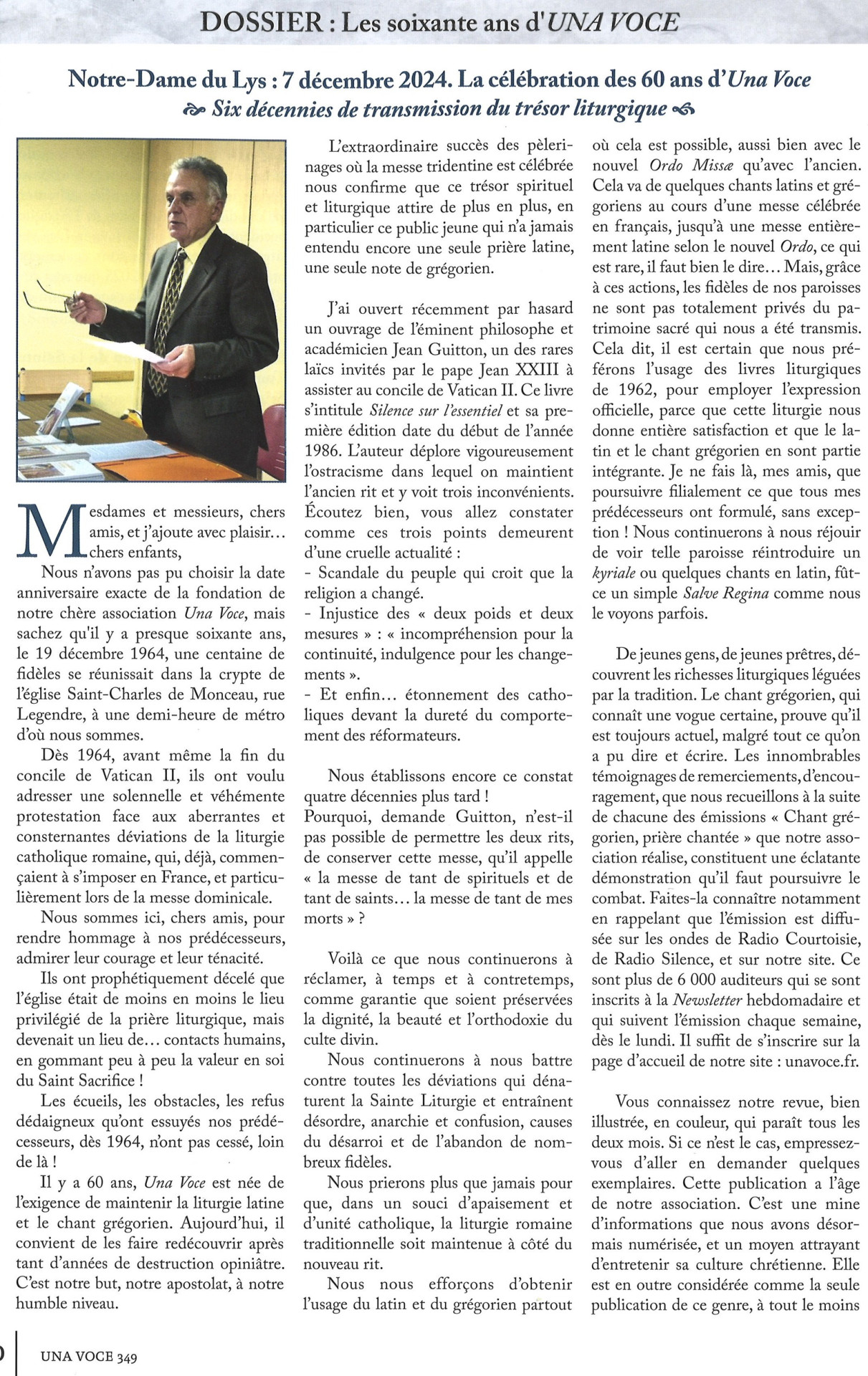 La revue Una Voce (n°350, Janvier – Février 2025), revue de l’association éponyme, revient sur les 60 ans de l’association fêté le 7 décembre 2024 à Paris. L’association « défend et promeut la liturgie latine, le chant grégorien et l’art sacré « dans le cadre de l’Eglise catholique romaine » selon ses statuts.