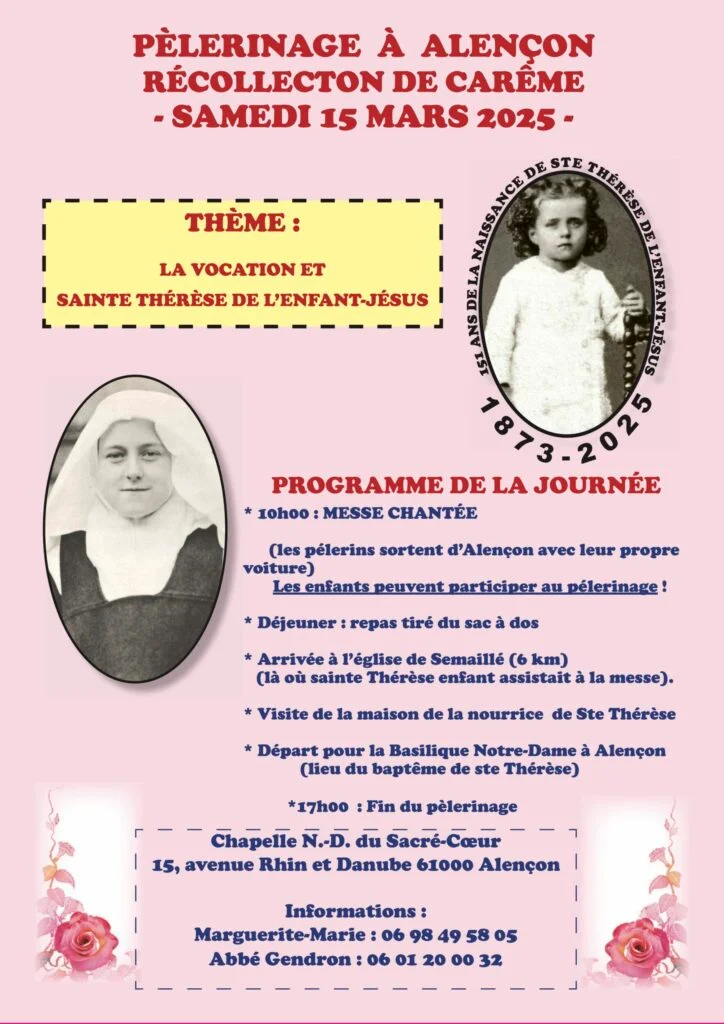 Accueil » Nos archives » Récollection-Pèlerinage à Alençon (FSSPX) le 15 mars Summorum Pontificum Récollection-Pèlerinage à Alençon (FSSPX) le 15 mars La Chapelle Notre-Dame du Sacré-Cœur à Alençon (FSSPX) propose une récollection-pèlerinage le samedi 15 mars : Article précédentValence : le diocèse rénove ses églises du XXe siècle Article suivantHospitalisé, le pape publie un nouveau texte sur la liturgie 3 mars 2025